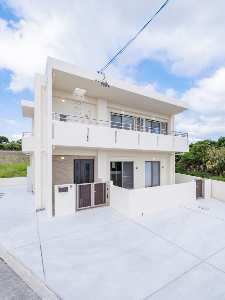 賃貸マンション・アパート建築 浦添市建物外壁のアイボリー系タイルは、温かみあるデザインで周辺地域に調和。白で統一した室内は、清潔感と空間の広がりを演出